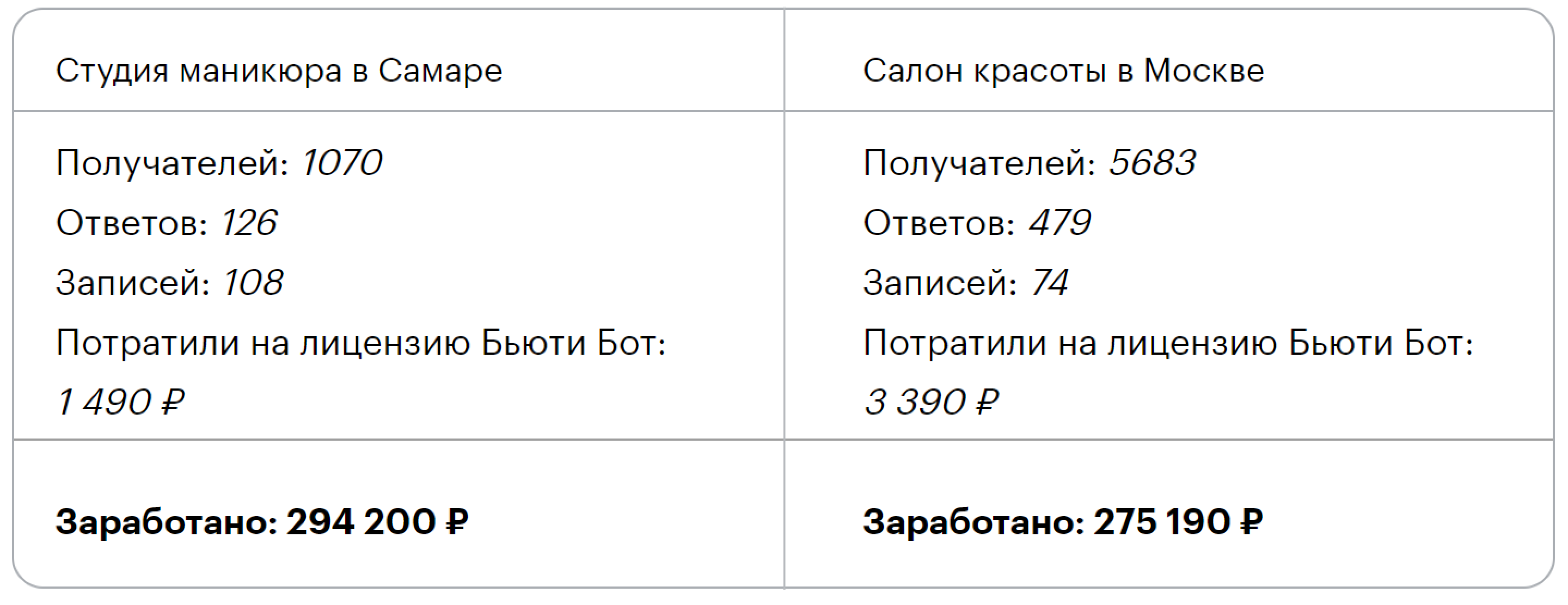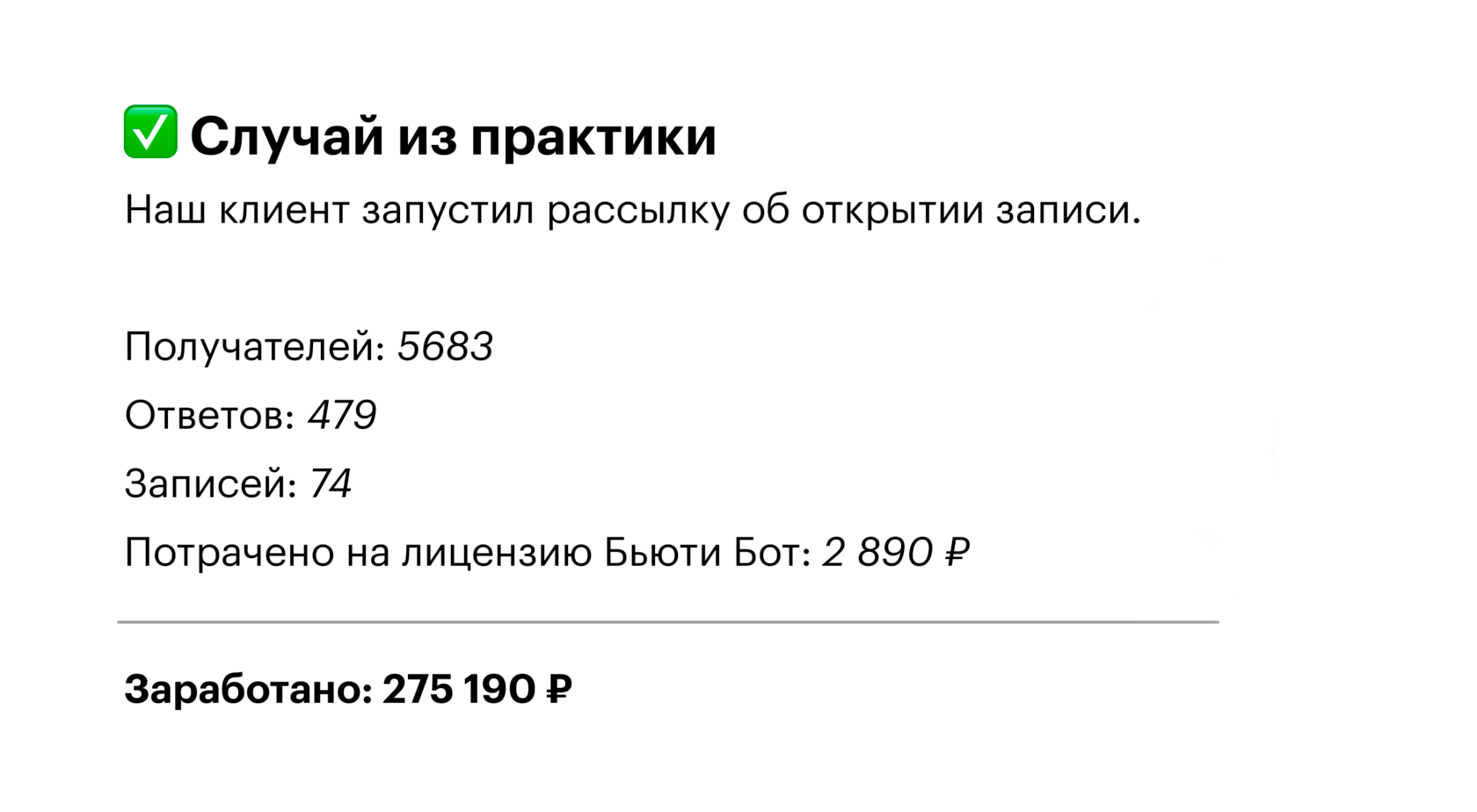 Посмотрим на цифры. Одной массовой рассылкой через Бьюти Бота можно вернуть до 50 клиентов из вашей базы. Подписка на наш сервис в среднем стоит 2 390 рублей в месяц. Получается, что привлечь одного действующего клиента стоит всего 48 рублей, тогда как новый клиент обходится в среднем от 500 до 1 000 рублей. Разница в цене колоссальная.