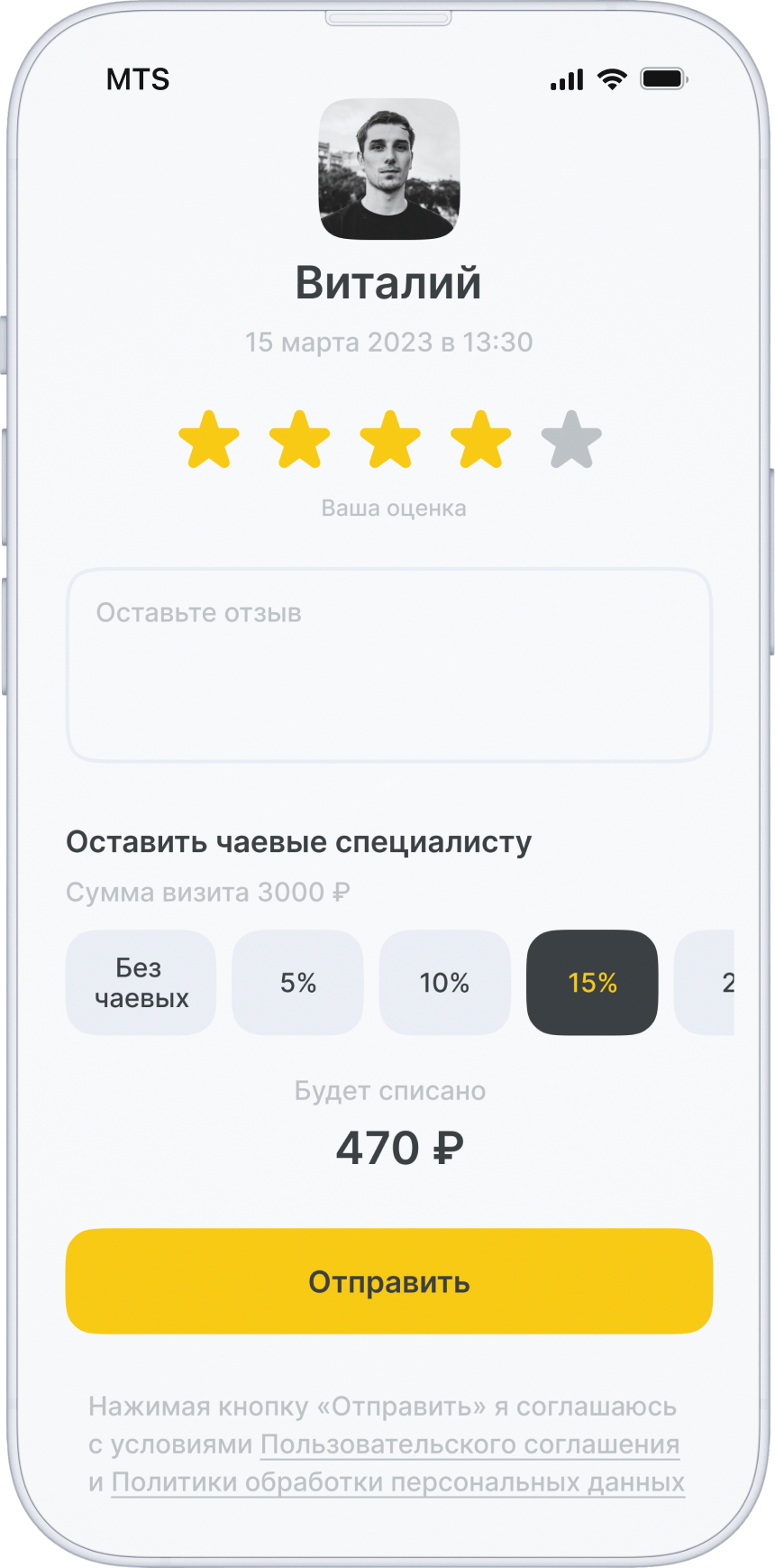 Клиент выбирает из списка нужного специалиста, вводит сумму чаевых и оплачивает картой. Готово!