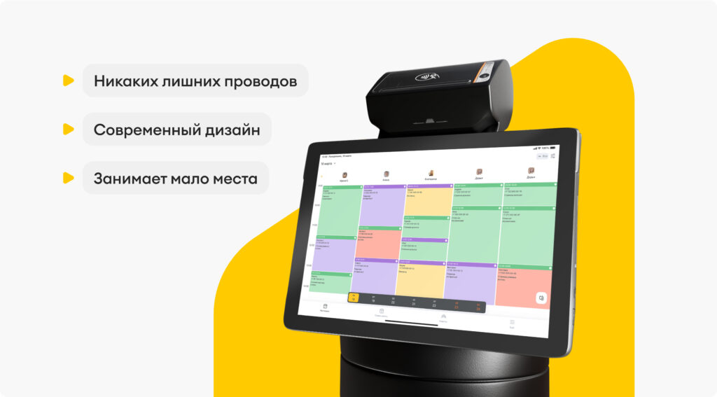 YBOX — компактный планшет, который объединяет функционал YCLIENTS и полноценного платежного терминала с фискальным накопителем. Все нужные функции уже встроены в нашу смарт-кассу. Другие устройства не понадобятся. YBOX заменит: