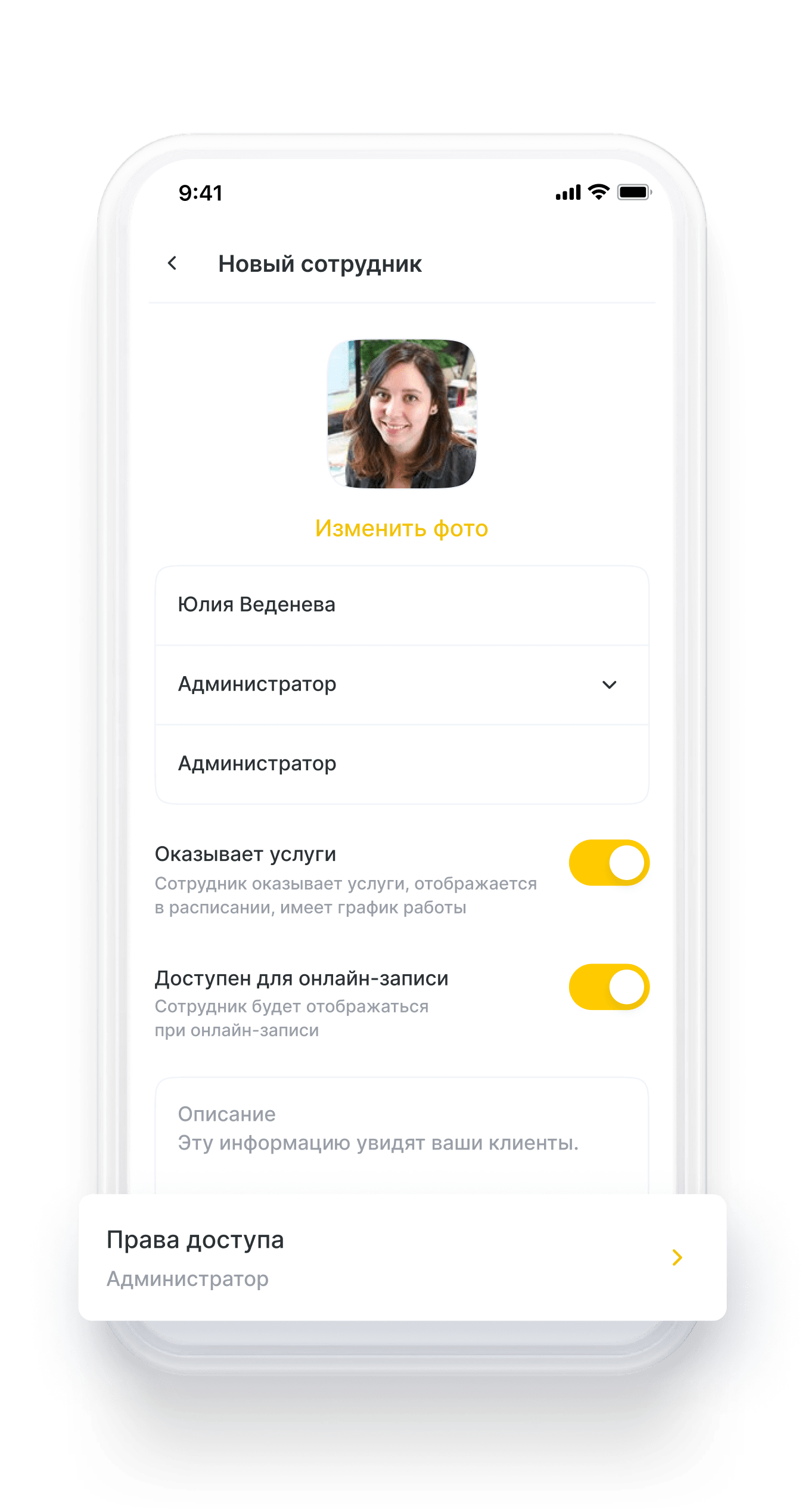 Когда вы выберите роль из списка, пользователь автоматически получит соответствующий набор доступов к разделам YCLIENTS