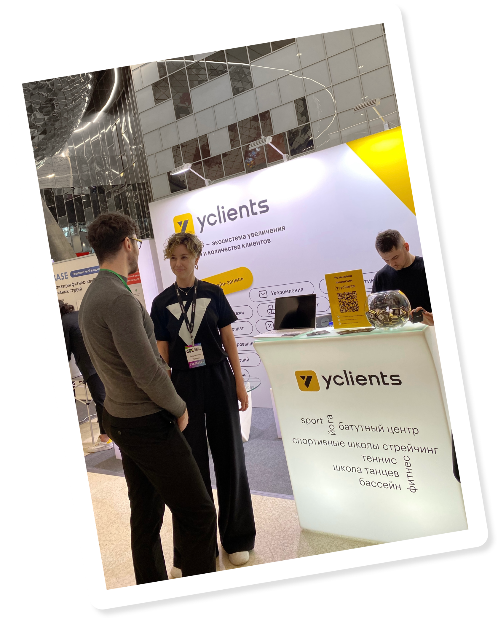 - 28-29 апреля посетили деловой форсайт-форум для управленцев и тренеров Global Fitness Evoltion. На нашем традиционно ярком стенде менеджеры отвечали на все вопросы об экосистеме YCLIENTS и даже «гадали» на бизнес-будущее всем посетителям выставки с помощью интерактивного предсказателя.