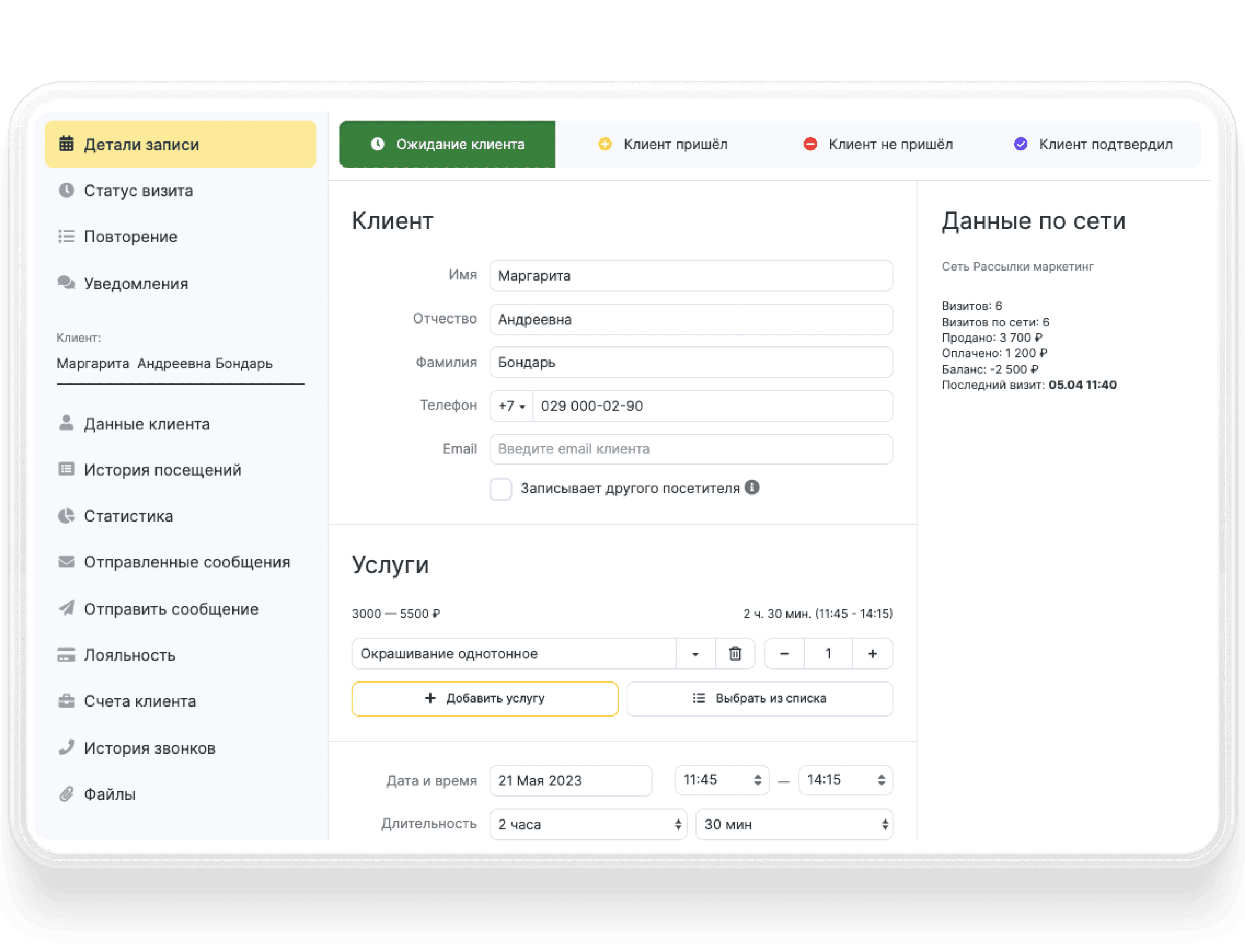 Теперь в YCLIENTS появилась возможность указывать фамилию и отчество клиента отдельно. Не нужно создавать дополнительные поля. При отправке уведомлений вы автоматически будете обращаться к клиенту по имени, а не по ФИО.