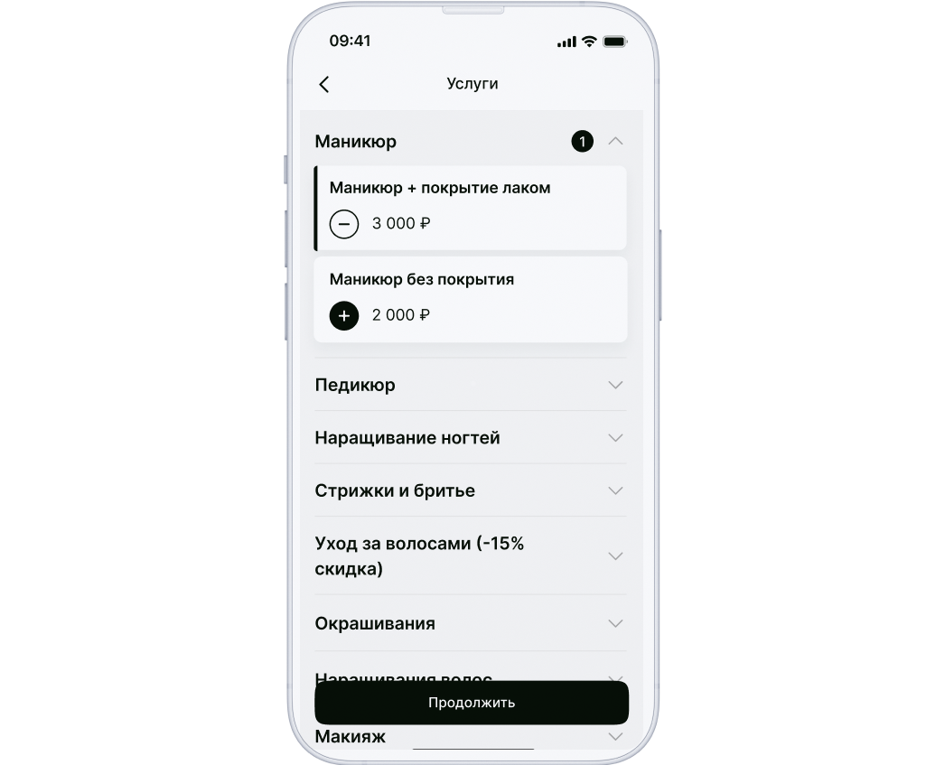 Вы можете включить режим сворачивания для списка услуг, чтобы клиент видел сразу все категории. Так удобнее ориентироваться в прайсе и проверять, какие услуги уже выбраны для записи. Режим сворачивания будет удобен для филиалов с большим количеством процедур.
