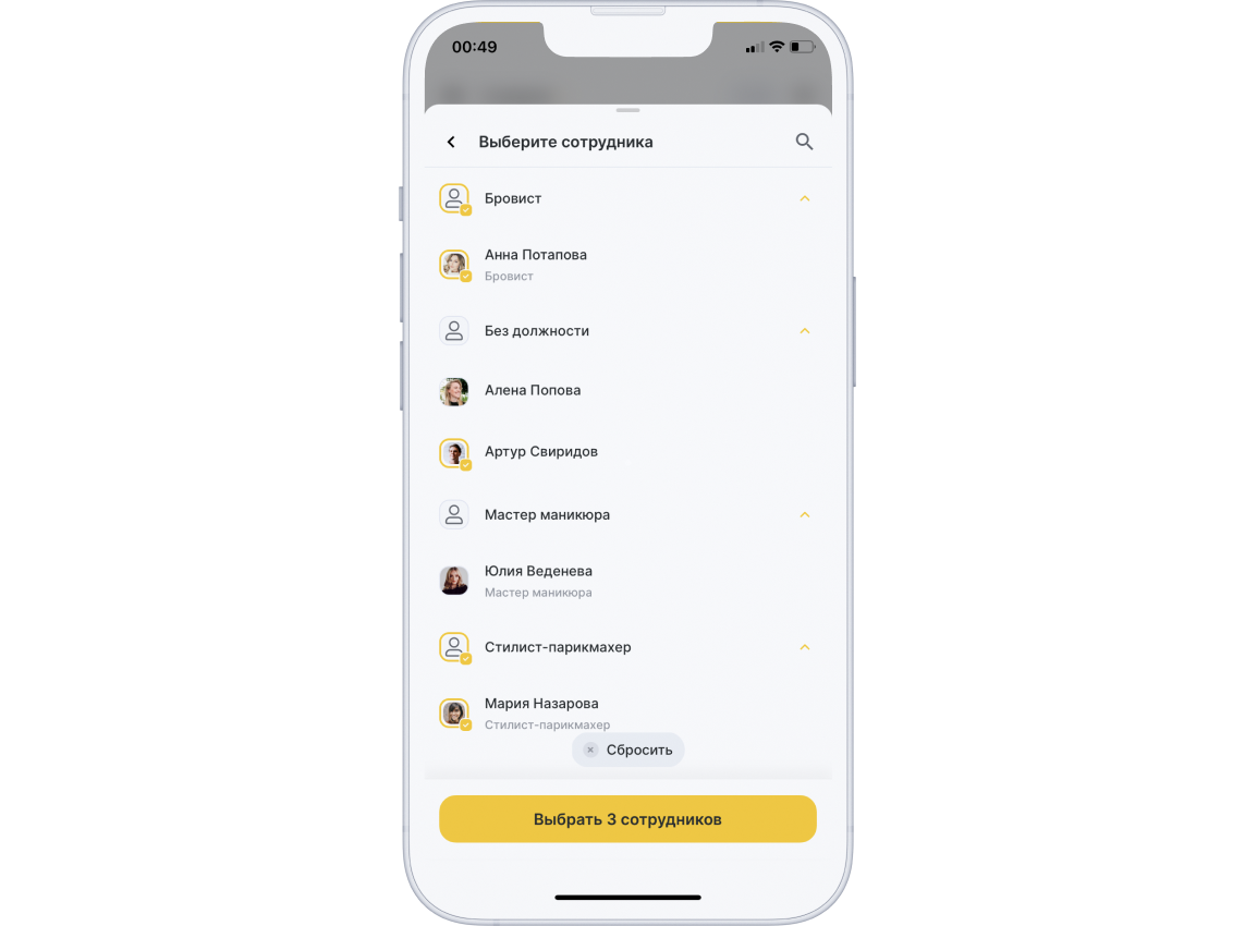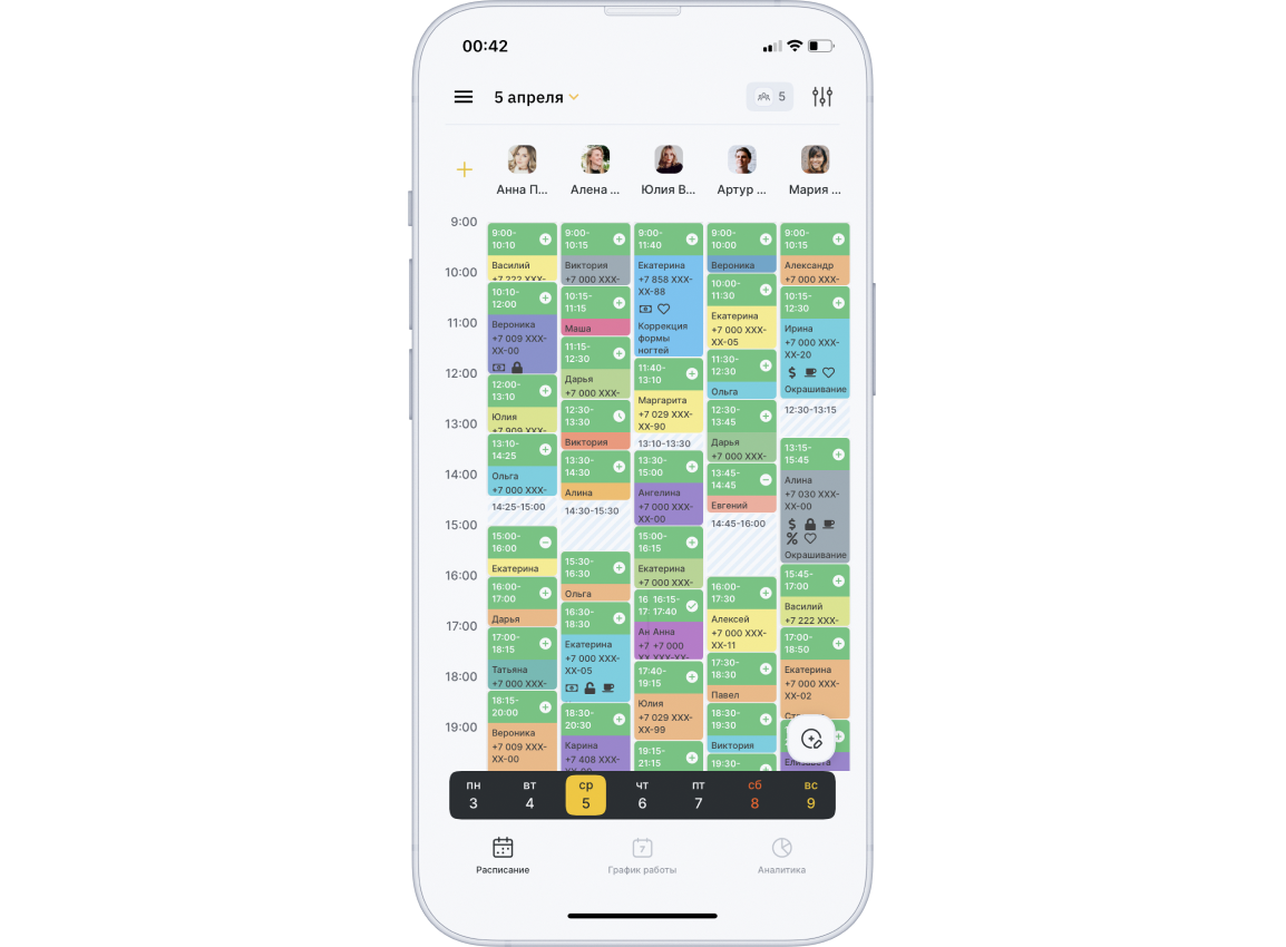 Просматривайте расписание нужных сотрудников. Выбирайте специалистов и мгновенно оценивайте их загруженность. Разгружайте самых занятых специалистов и увеличивайте занятость тех, к кому пока не слишком часто записываются.