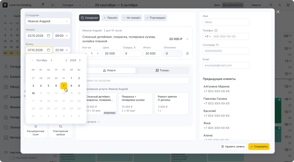 Для бизнеса в сфере авто в YCLIENTS появилась возможность записывать посетителей сразу на несколько суток — до 7 дней включительно. Новая опция упростит работу автомастерским, малярно-кузовным сервисам и студиям детейлинга.