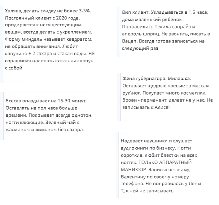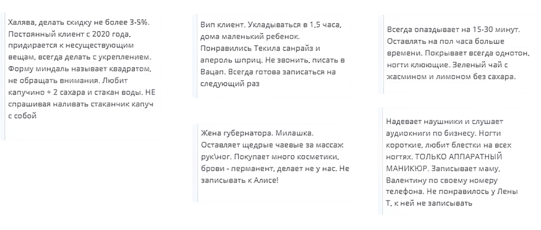 Несколько примеров из карточек в YCLIENTS, как мы описываем важные особенности клиентов