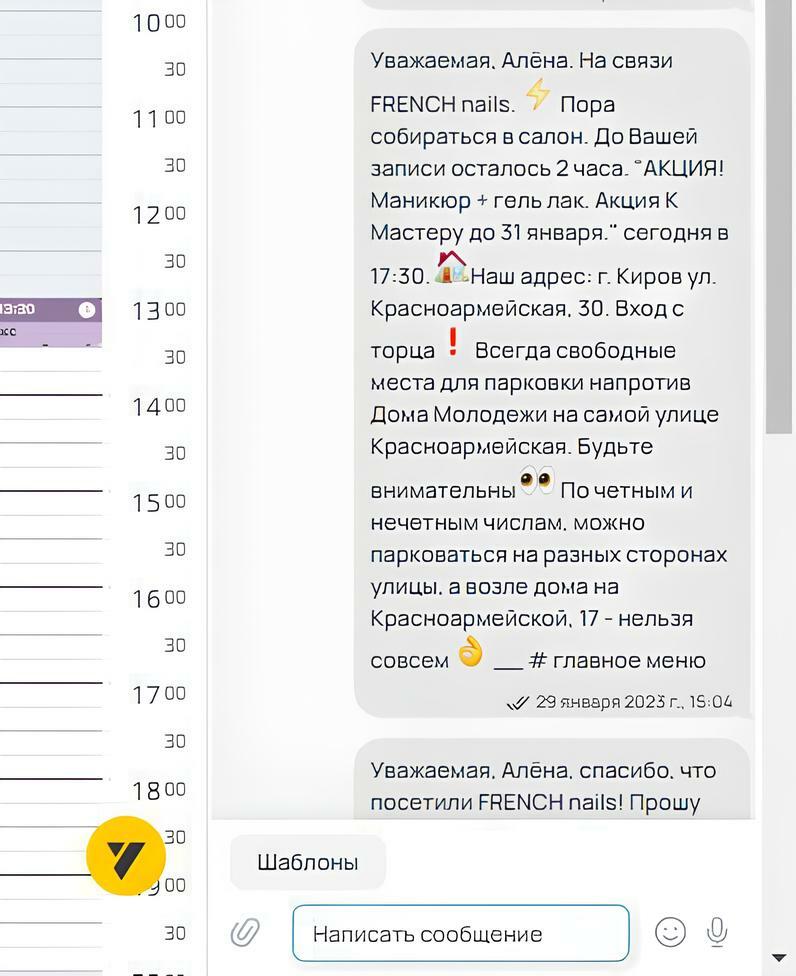 На тот момент мы были в Яндексе на 7 месте по запросам «сделать ногти в Кирове», «маникюр Киров» и подобные. Стали отправлять клиентам во время визита, после выставления администратором статуса в YCLIENTS «Клиент пришел», автоматические сообщения:
