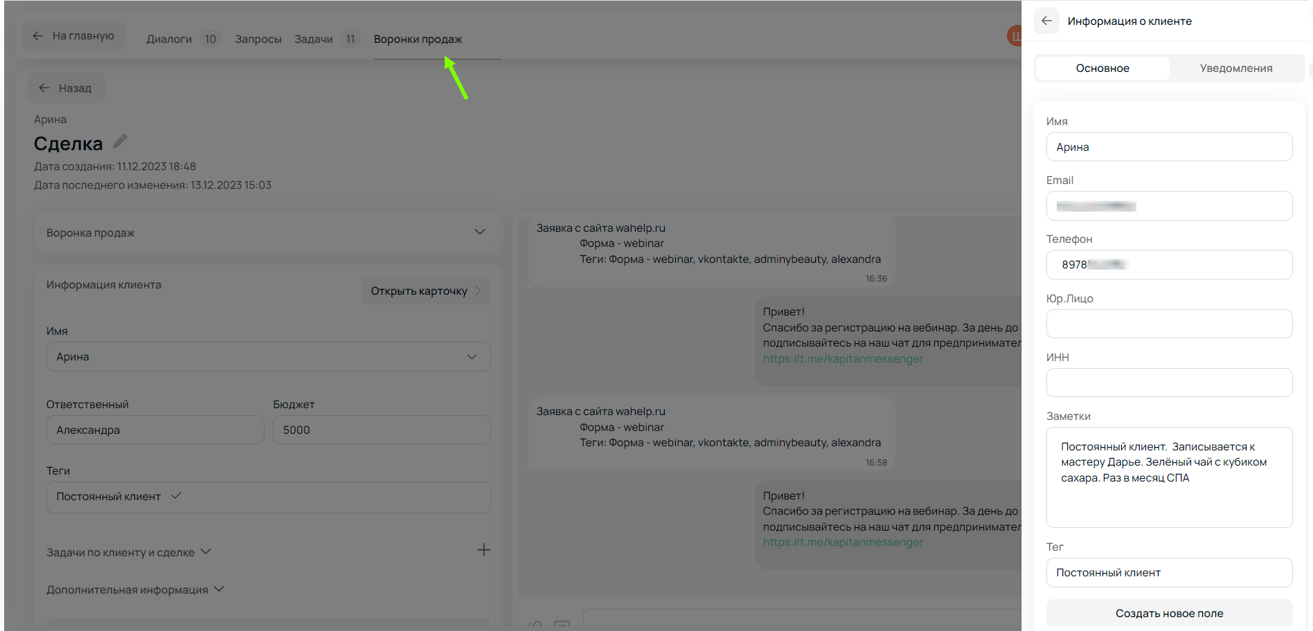 Чтобы сделать общение с клиентом персонализированным, можно открыть его карточку прямо в разделе «Воронка продаж». Так у менеджера перед глазами будет вся информация о клиенте: имя, контакты и важные комментарии — вплоть до того, какой кофе он любит.