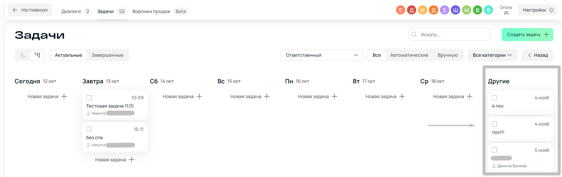 Эта функция помогает отслеживать дела, переносить задачи, добавлять и менять описание к ним. Задачи можно ставить на ближайшую неделю. Если дело нужно сделать не в течение семи дней, а позже, то его можно добавить в категорию «Другие». Поставить задачу может любой сотрудник. Руководитель — на кого угодно. Остальные — на себя, коллег и подчиненных.