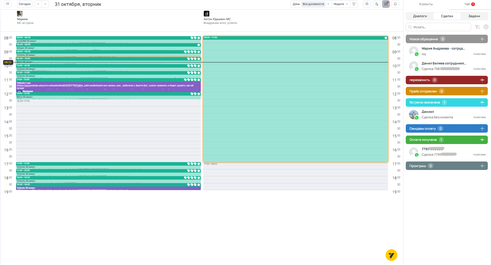 Чат, воронка и задачник Wahelp в интерфейсе Журнала записи YCLIENTS.