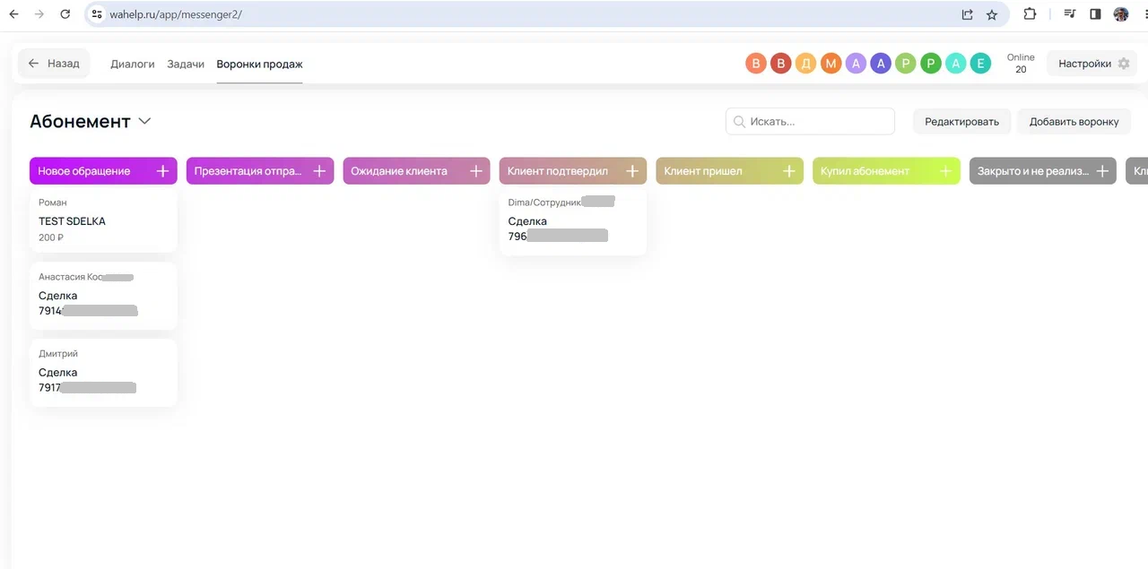 Воронку в Wahelp вы можете настроить под свои нужды. Выбрать количество и последовательность этапов, установить триггеры (например, чтобы бот автоматически отправлял нужное сообщения клиенту), настроить цвет блоков, включить или отключить автозадачи и автосообщения.
